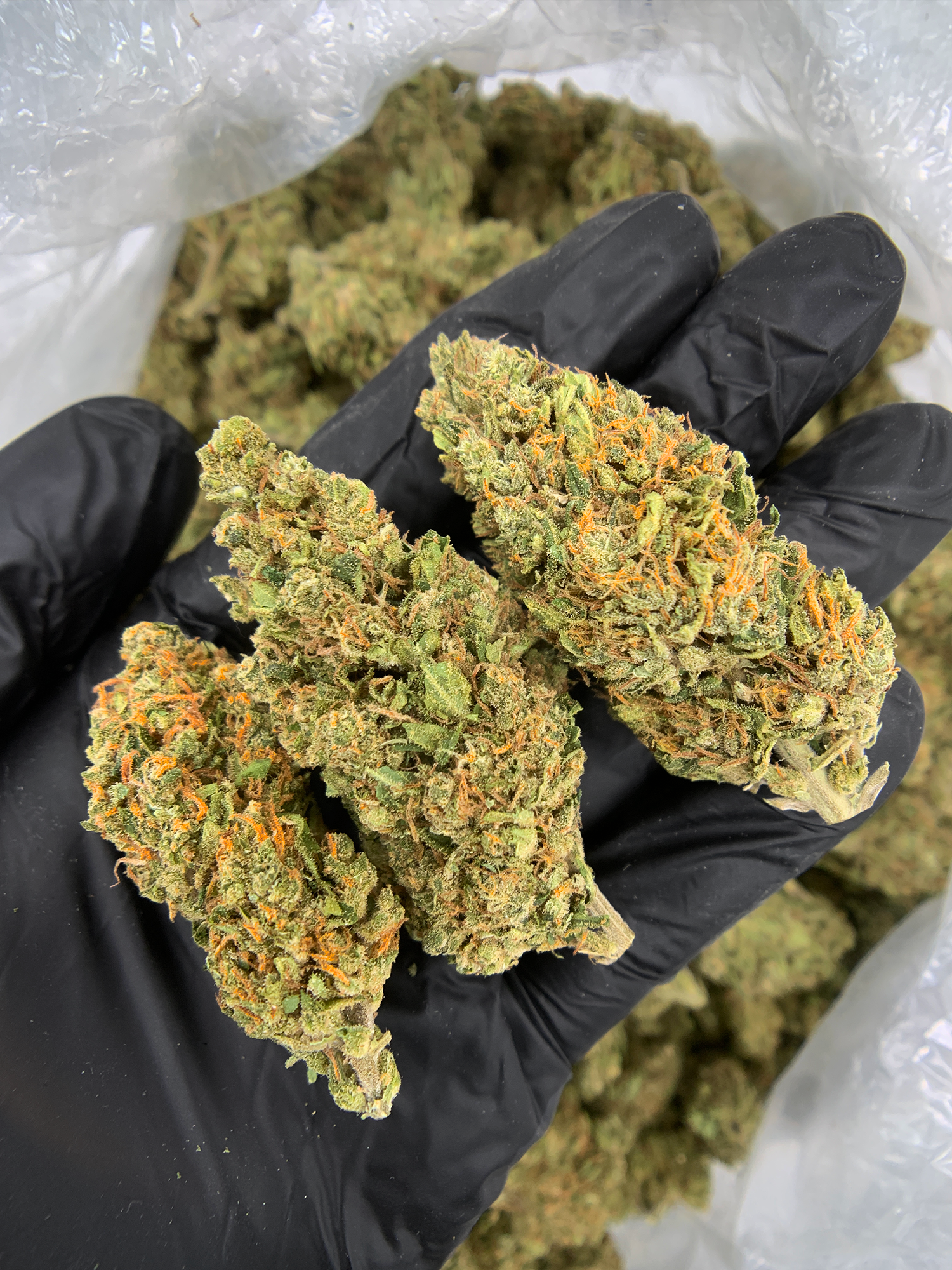 • Appearance: Dark green buds, deep orange pistils, heavy trichome frosting