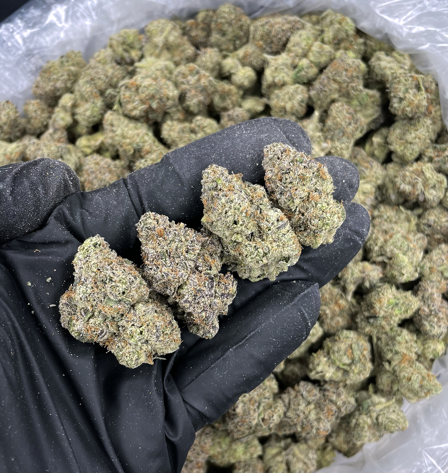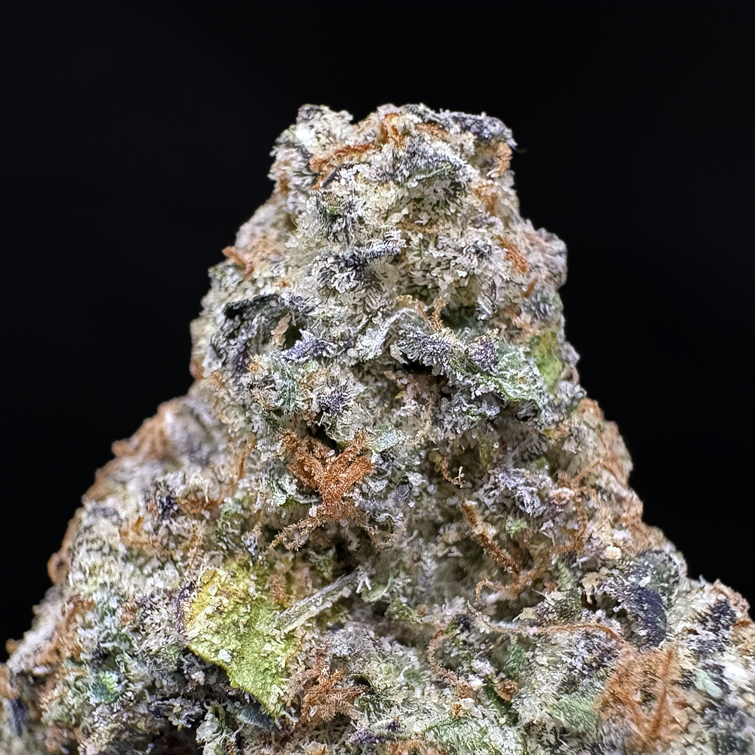 Appearance: Dense buds, green with orange hairs and subtle purple tint