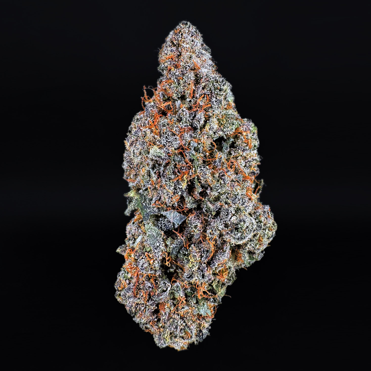 Appearance: Deep purple buds with heavy trichome frosting and fiery orange hairs