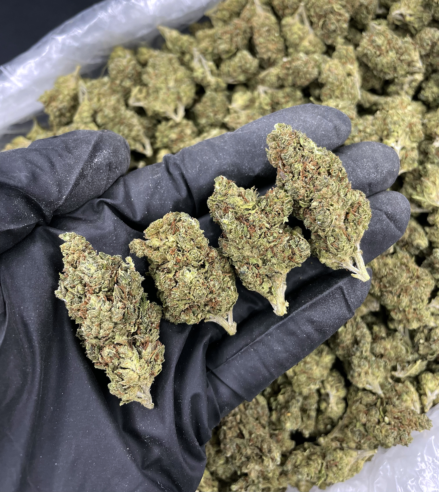 Appearance: Grape-shaped dark olive-green buds, purple undertones, red-orange hairs, chunky white trichomes