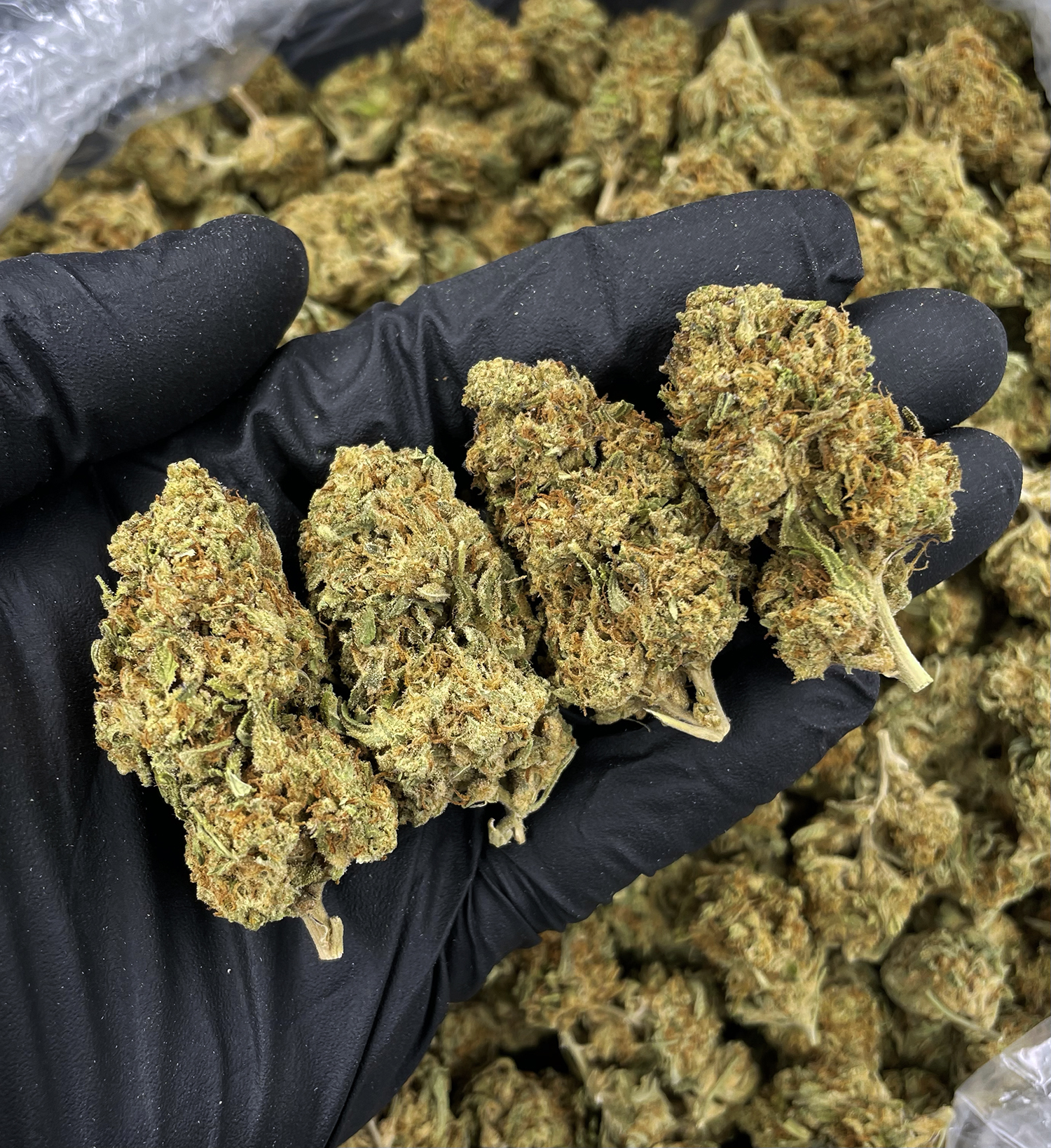 Appearance: Dense spade-shaped dark olive buds, purple undertones, orange hairs, frosty trichomes