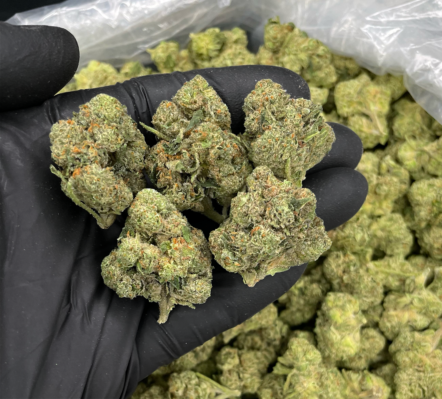 Appearance: Dense gumdrop-shaped forest green buds, olive leaves, thin orange hairs, chunky white trichomes