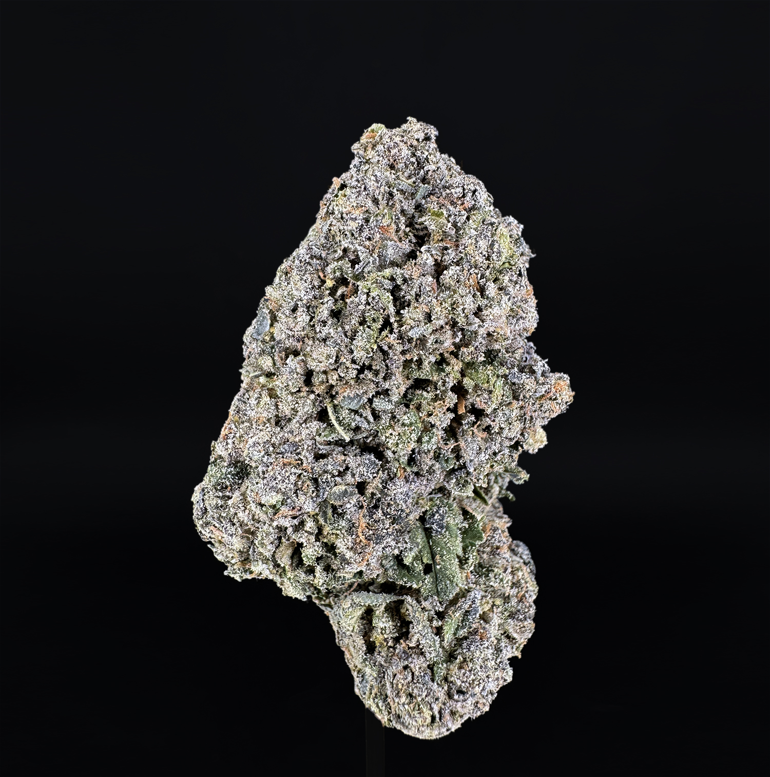 Appearance: Fluffy, grape-shaped neon-green buds with dark olive accents, fiery orange hairs, and frosty mint-white trichomes