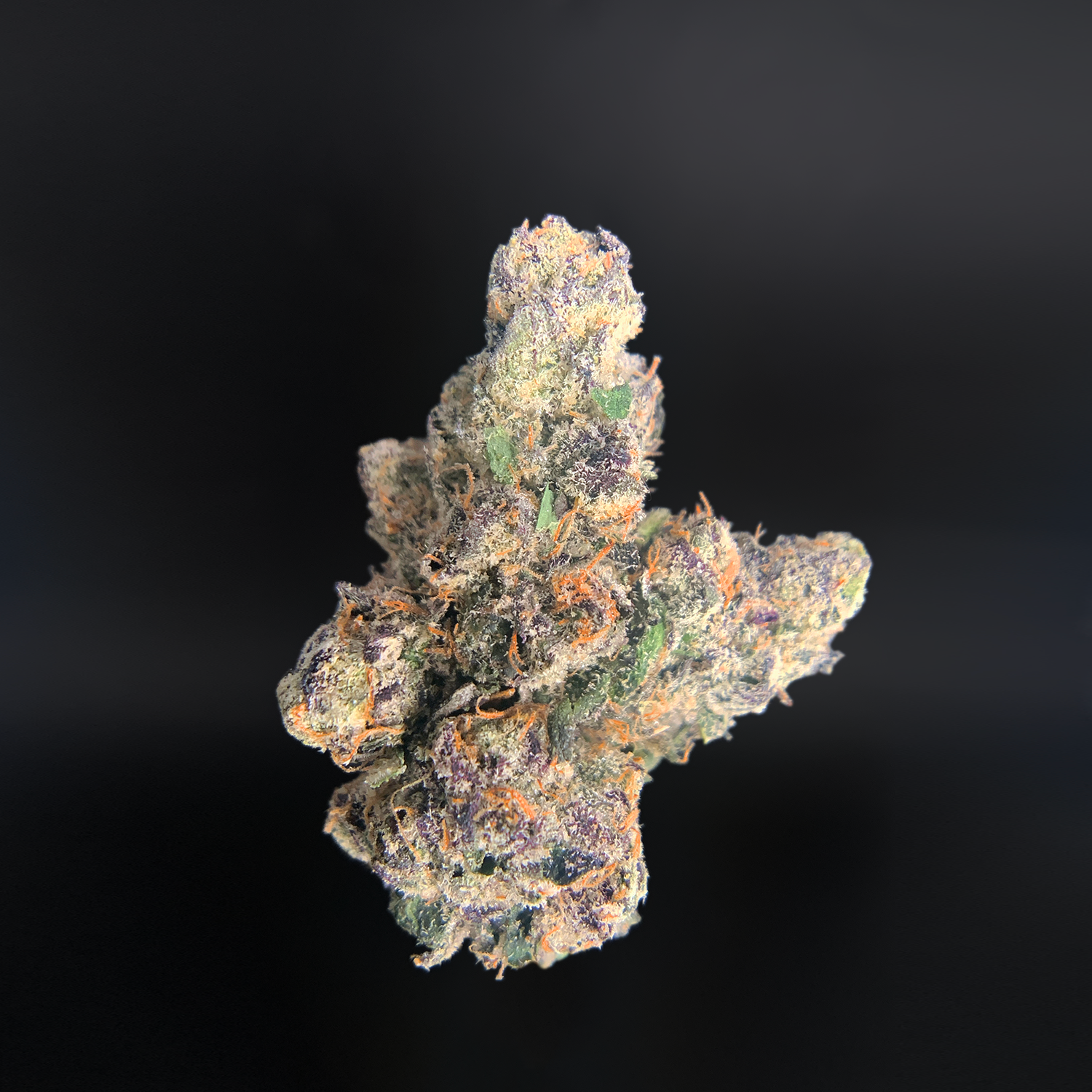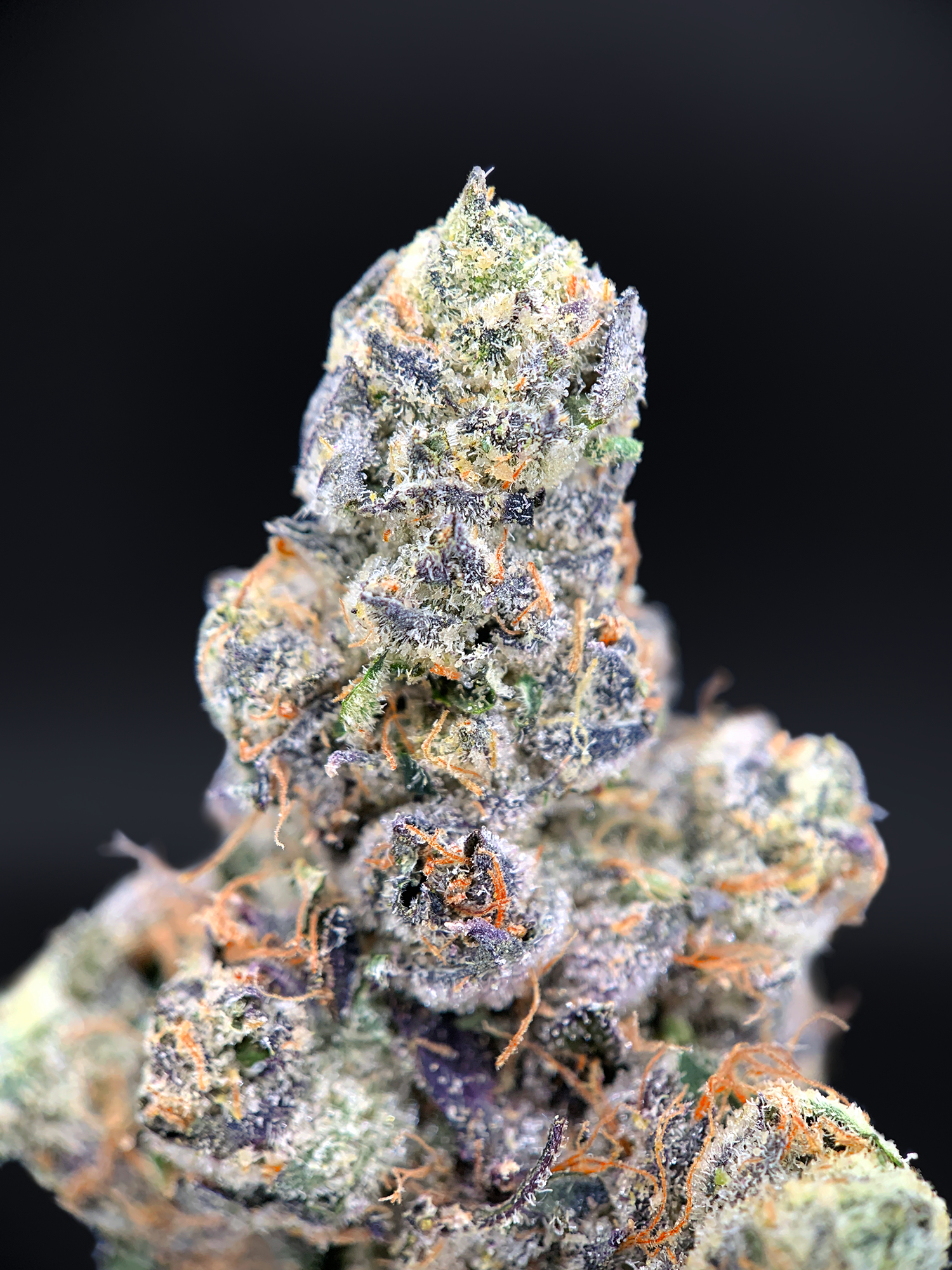 Dense, tightly structured buds display deep purple saturation layered over forest green undertones, with bright pistils and a thick coating of resin that gives the surface a frosted, almost lacquered appearance. The influence of the Prizm lineage is immediately visible — tighter architecture, higher resin production, and a polished, top-shelf finish.