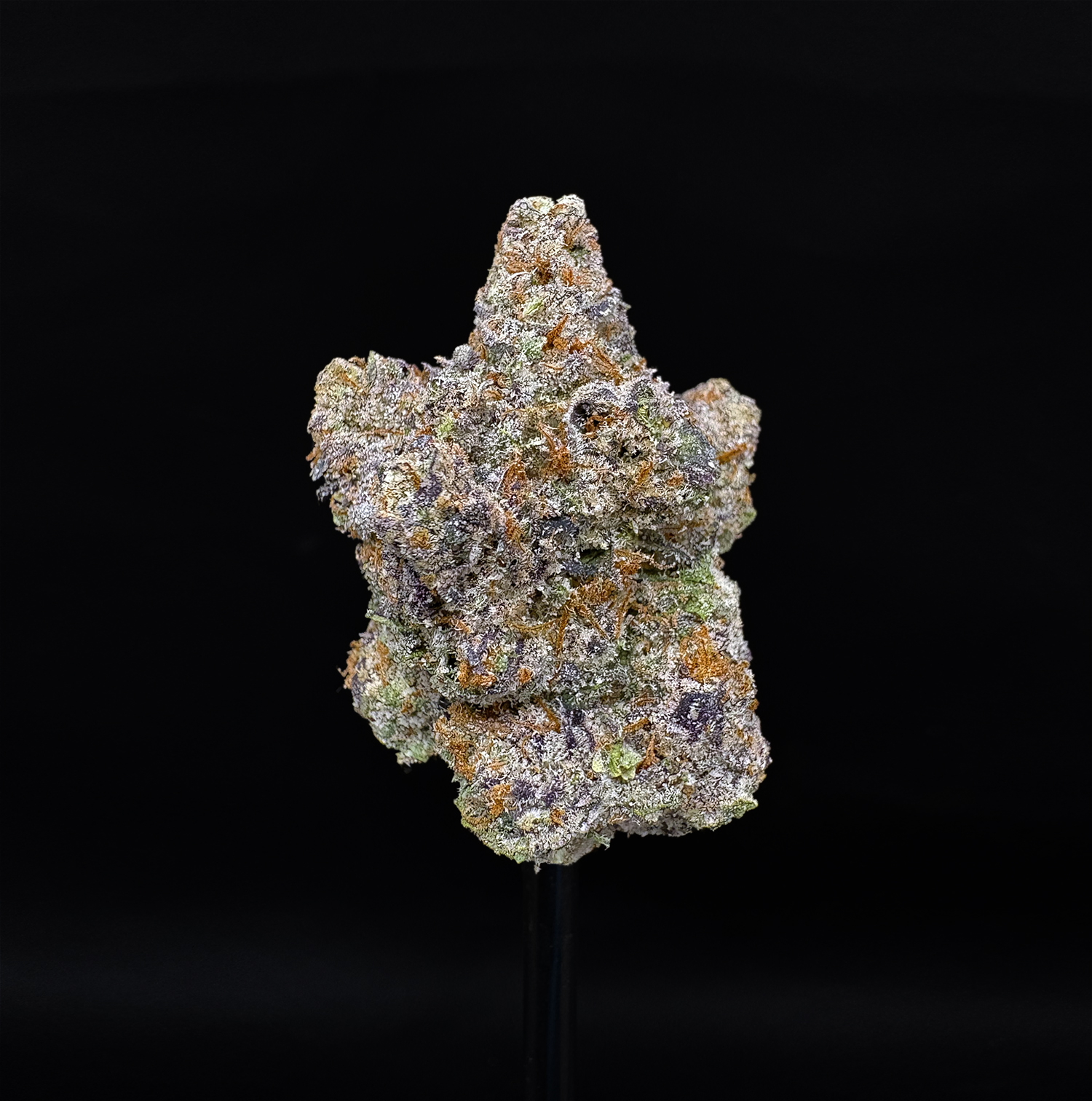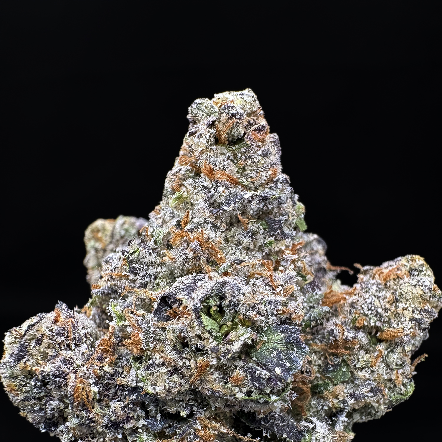 Appearance: Dense olive green buds, spade-shaped structure, orange hairs, frosty amber trichomes