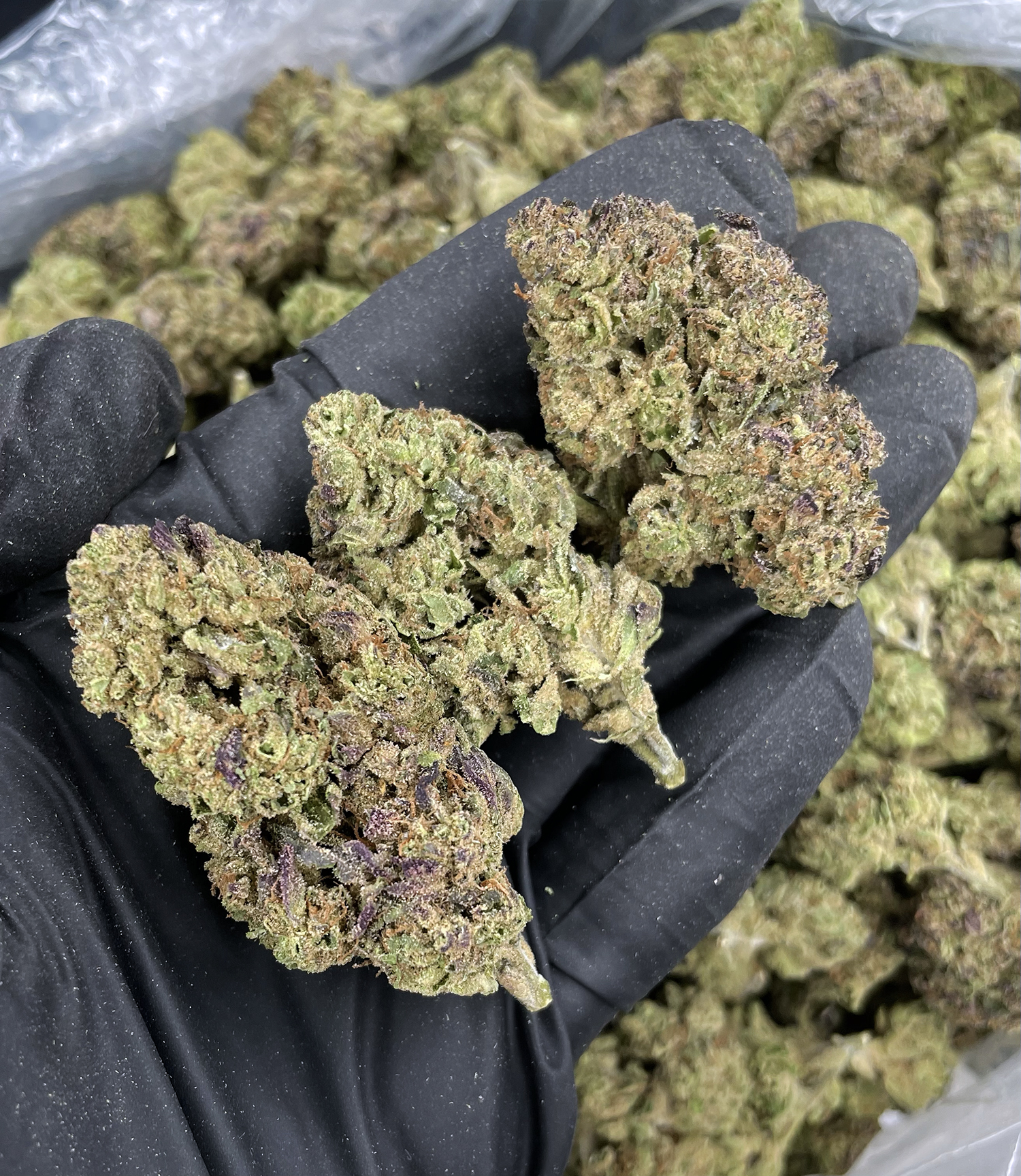 Appearance: Dense grape-shaped buds, neon green with purple undertones