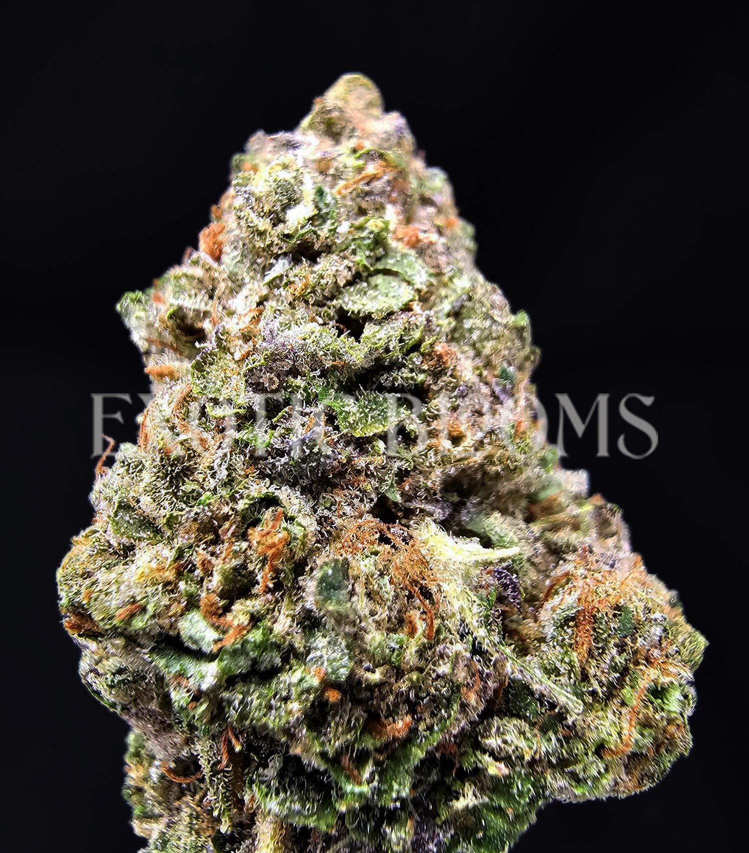 Appearance: Spade-shaped olive green nugs, purple hues, orange hairs, purple-tinged white trichomes