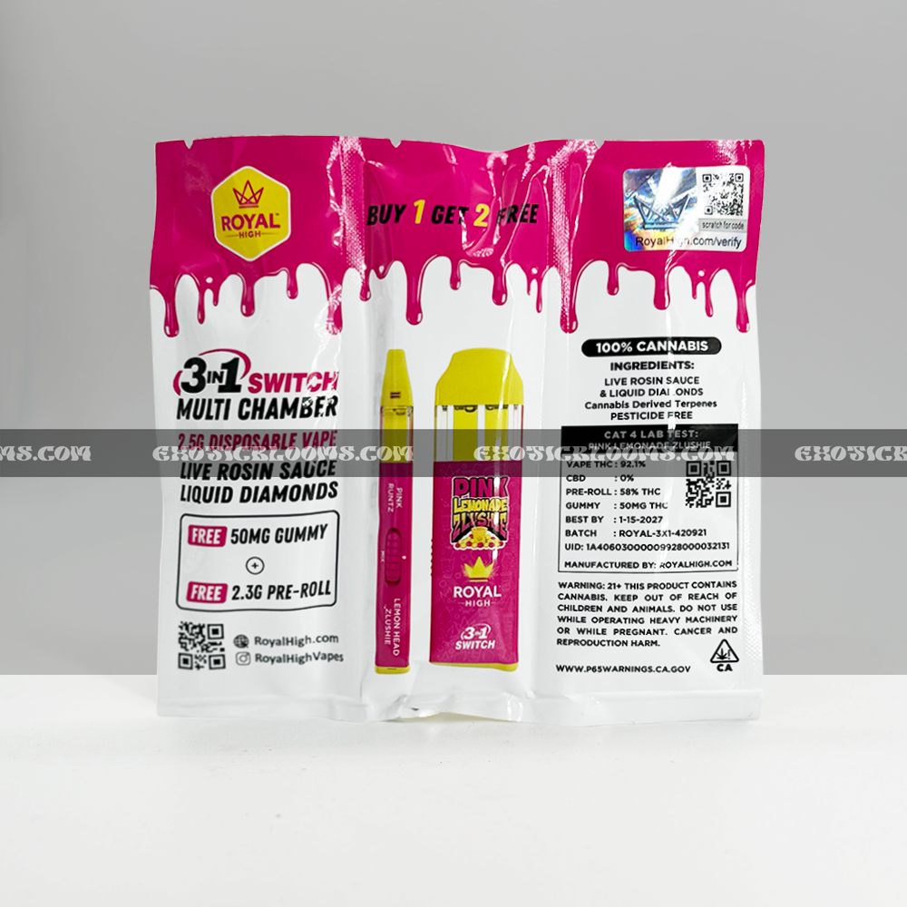 Order online Royal High 2.5g Switch weed pen delivery. Exotic Blooms delivers a curated selection of concentrates, flowers, edibles, and brands for Adult-Use in Northern Virginia. You can order online Royal High 3in1 Disposable Pen cannabis weed and have it delivered to your door in Richmond, Midlothian, Short Pump, Williamsburg, and most neighboring cities. Simply order online, via text, or give us a call! Delivery to most neighborhoods in VA takes under 1.5 hour. You will receive a time window of when you can expect your driver.
