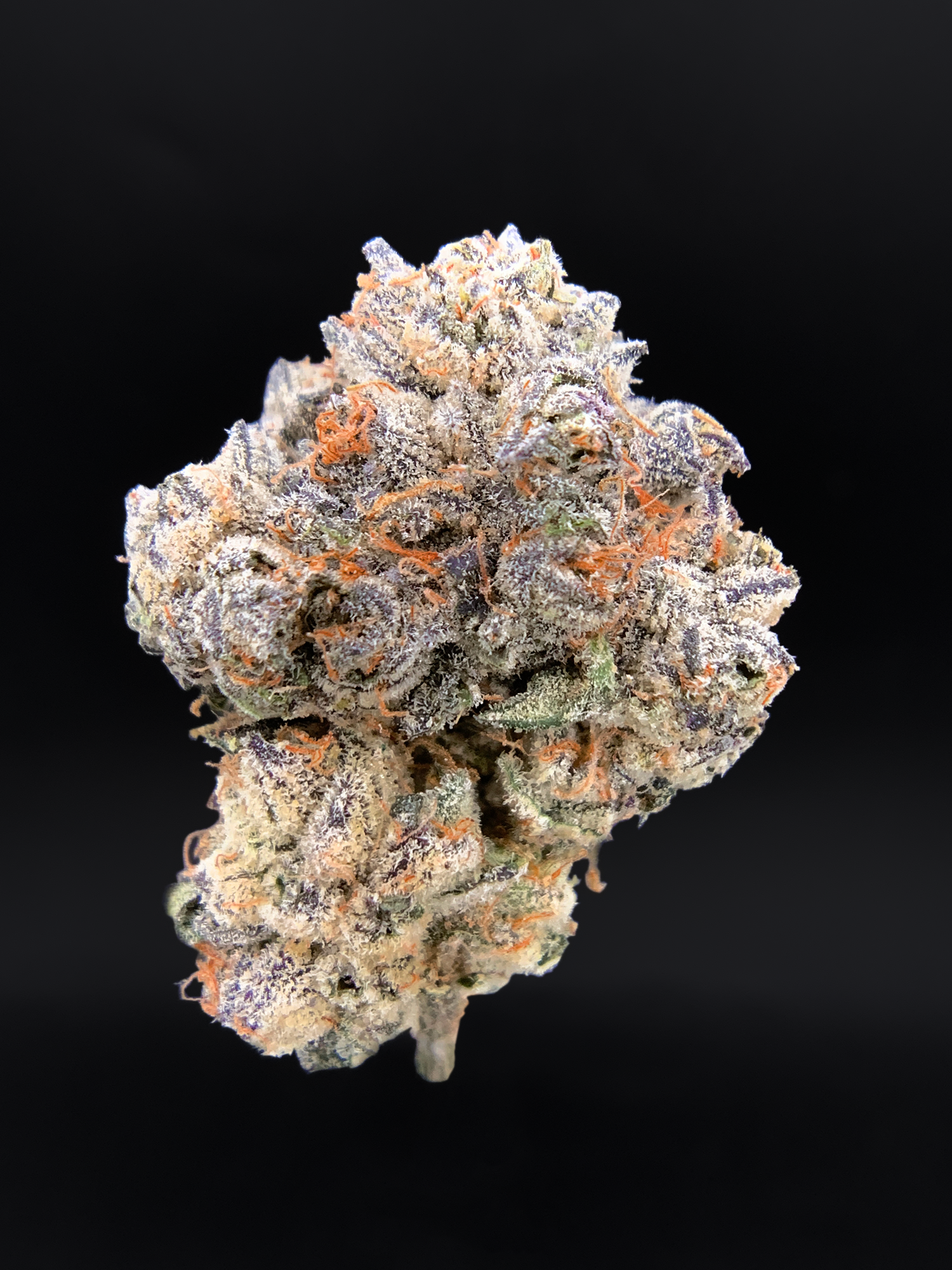 The buds arrive dense and mountainous — forest green and royal violet wrapped in heavy crystalline frost. Trichome coverage is thick, almost snow-like, giving the flower a luminous finish rarely seen outside curated drops.
