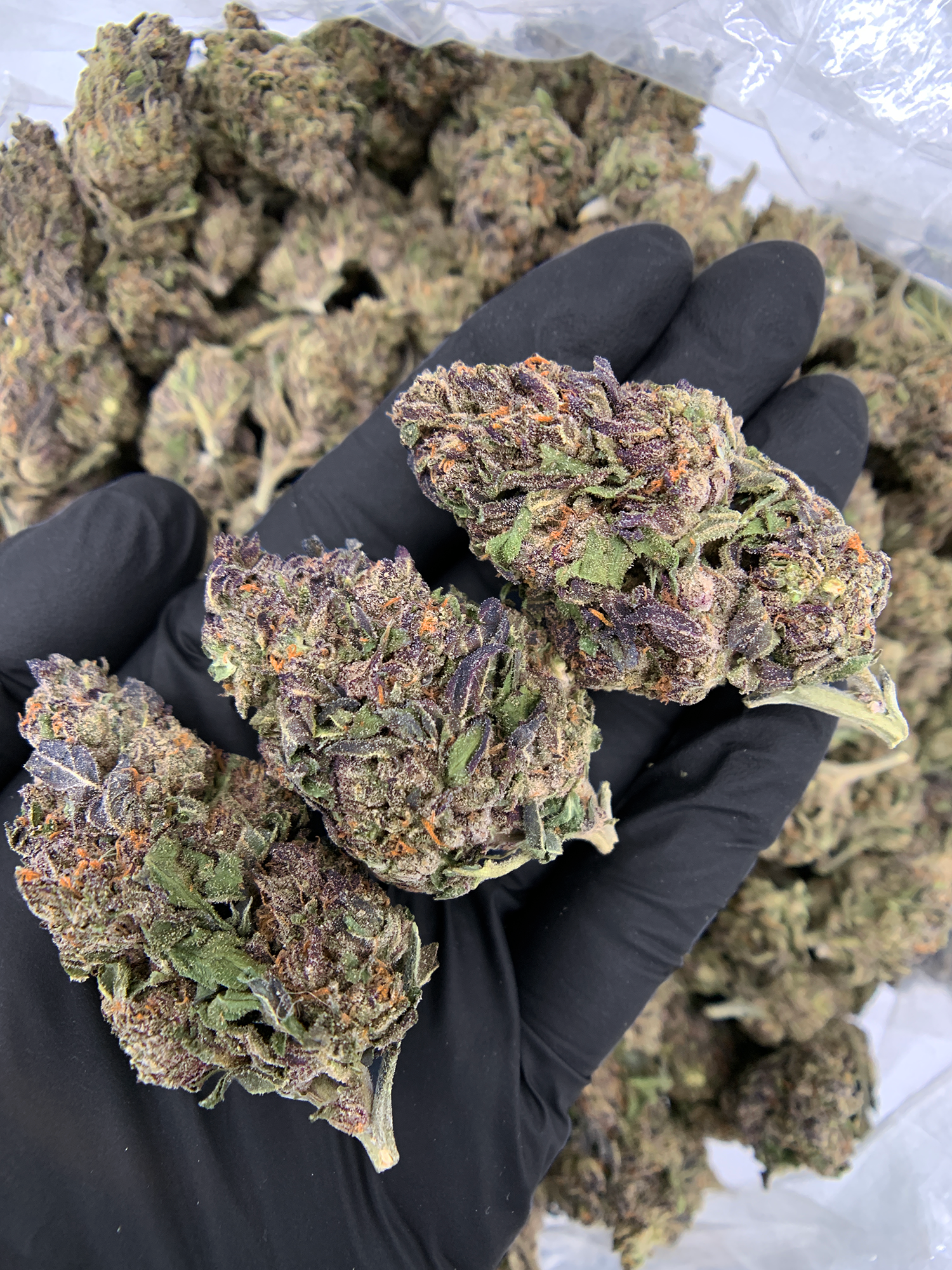 Dense, resin-heavy buds showcase vibrant green tones threaded with orange pistils and a thick frost of trichomes that glisten under light. The visual appeal alone signals boutique indoor quality.